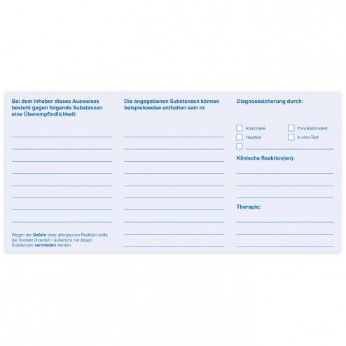 Unser neuer Allergiepass ist im Design an den bewährten Röntgenpass von AllProMed angelehnt. Sein seriöses Erscheinungsbild sorgt dafür, dass die Eintragungen ernstgenommen werden, auch wenn es sich bei dem Ausweis nicht um ein offizielles Dokument handelt. Das Wissen um allergieauslösende Stoffe und Reaktionen kann lebensrettend sein. Übersichtliche Freifelder im AllProMed-Allergiepass bieten ausreichenden Platz, um auch Kreuzallergien und Unverträglichkeiten sowie Notfallmedikationen ausführlich zu vermerken.