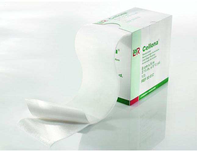 Selbstklebendes Polstermaterial aus luftdurchlässigem Nadelvlies (50 % Polyester, 30 % Polypropylen, 20 % Viskose), vollflächiger Kleberauftrag, mit hautfreundlichem Polyacrylat-Kleber.
