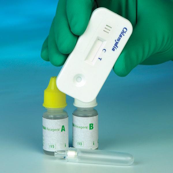 OHNE INKUBIEREN! Chromatographischer Immunoassay für den qualitativen Nachweis von Chlamydia trachomatis im Zervixabstrich bei der Frau, Harnröhrenabstrich beim Mann und männlichen Urinproben zur Diagnose von Chlamydia-Infektionen. Nach 10 Minuten zeigt eine deutliche Färbung ein positives bzw. negatives Ergebnis an. Lagerung bei 2 ºC – 30 ºC.