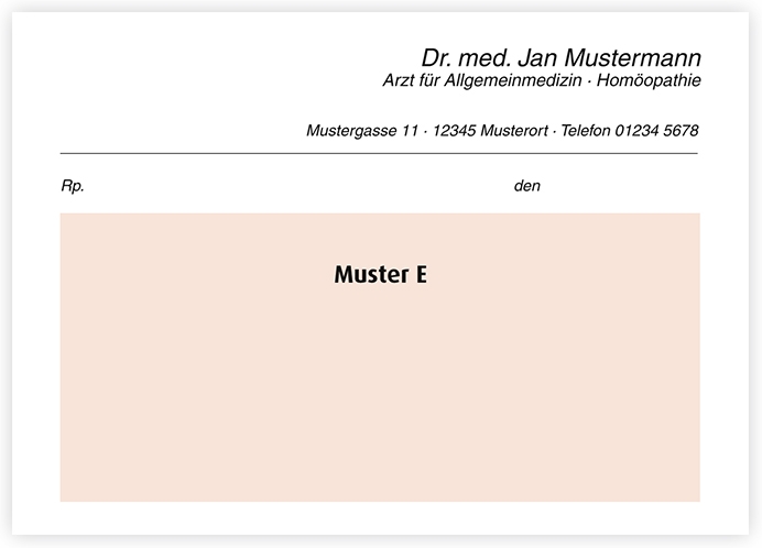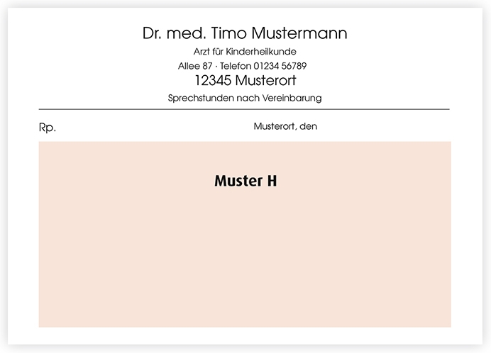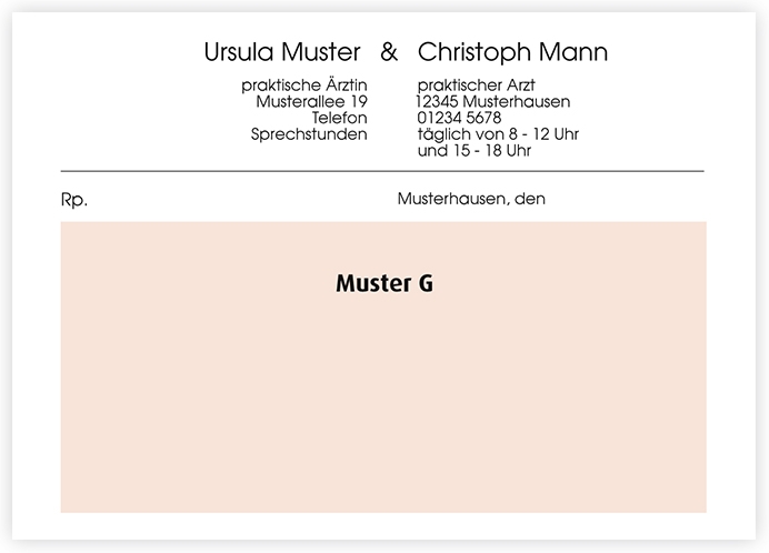 Privatrezepte mit individuell gestaltetem Kopf erhalten Sie bei uns in drei verschiedenen Grundfarben und in unterschiedlichen Formaten. Ob Helvetica oder Times, zentriert oder linksbündig, quer oder hoch – wir gestalten Ihr Rezept ganz nach Ihren Wünschen.