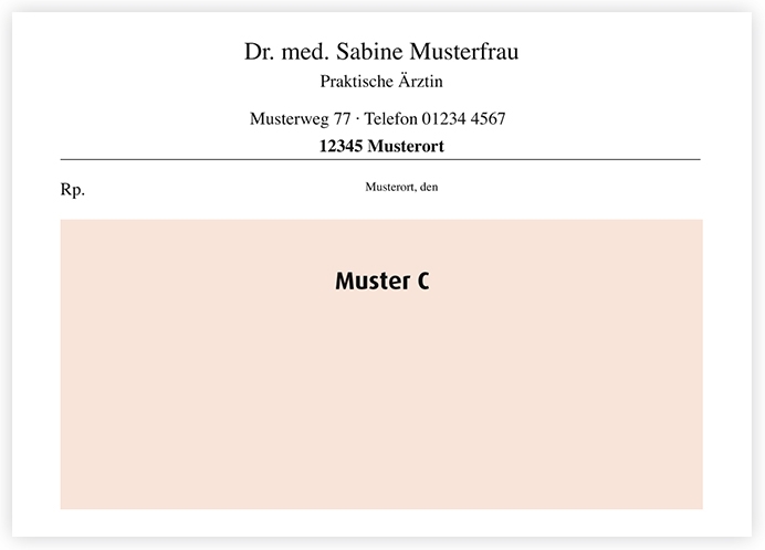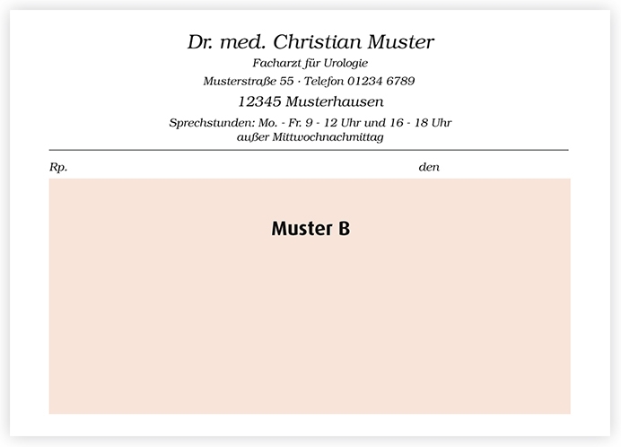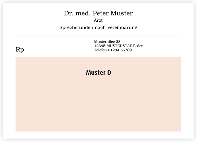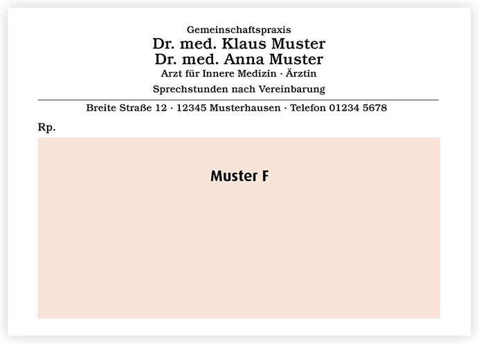 Muster 16Zur Zeitersparnis werden diese Kassenrezepte bereits mit vorgedruckten Daten Ihrer Praxis versehen. Selbstverständlich sind auch diese Formulare für Sie kostenlos – lediglich der Eindruck wird berechnet. Wir liefern Ihnen Ihre rosa Kassenrezepte in idealer Papierstärke, sodass sie mit Sicherheit mit Ihrem Praxis-Drucker kompatibel sind.Für Ärztinnen und Ärzte aus dem Einzugsgebiet Sachsen-Anhalt ist der Eindruck kostenlos. Bitte bedenken Sie bei der Konfiguration Ihres Kassenrezeptes, dass die Stempeleindrucke den Vorgaben der Arzneimittelverschreibungsverordnung (AMVV) entsprechen müssen. Weitere Informationen hierzu erhalten Sie unter folgendem Link: https://www.gesetze-im-internet.de/amvv/AMVV.pdfLeerzeilen sind bei der Personalisierung nicht möglich und werden bei der Produktion nicht berücksichtigt.