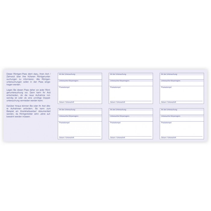 Mit 12 Stempelfeldern enthält der Röntgenpass von AllProMed viel Platz für die Dokumentation von Röntgenaufnahmen. Zugleich lässt er sich zu einem handlichen DIN-A7-Format falten. Damit ist eine lange Haltbarkeit gegeben. Durch den übersichtlichen Aufbau wird außerdem eine gute Vergleichbarkeit der Patientendaten erreicht.