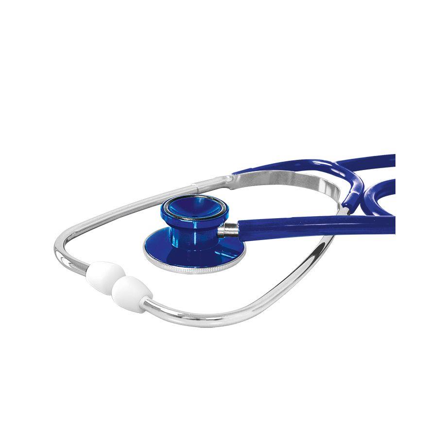 Stethoskop Doppelkopf ratiomed blau ausgezeichnete, variable Akustik durch Doppel-Bruststück, der Trichter des Bruststückes ist mit einem Kälteschutzring aus Gummi ausgestattet, außenliegende Ohrbügelfeder, mit weißen, harten Schraub-Ohroliven, 100% latexfrei und nickelfrei.