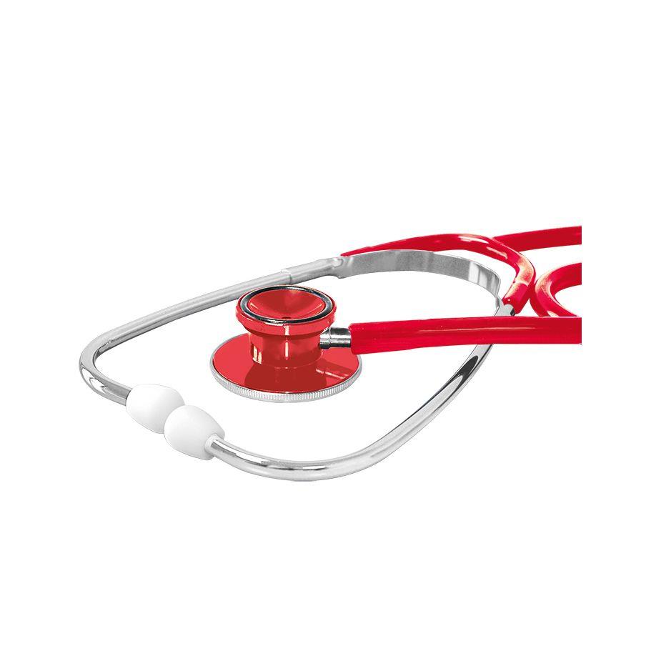 Stethoskop Doppelkopf ratiomed rot ausgezeichnete, variable Akustik durch Doppel-Bruststück, der Trichter des Bruststückes ist mit einem Kälteschutzring aus Gummi ausgestattet, außenliegende Ohrbügelfeder, mit weißen, harten Schraub-Ohroliven, 100% latexfrei und nickelfrei. Membrane: 43 mm Ø, Trichter: 30 mm Ø, Gesamtlänge: 80 cm, Gewicht: ca. 90 g
