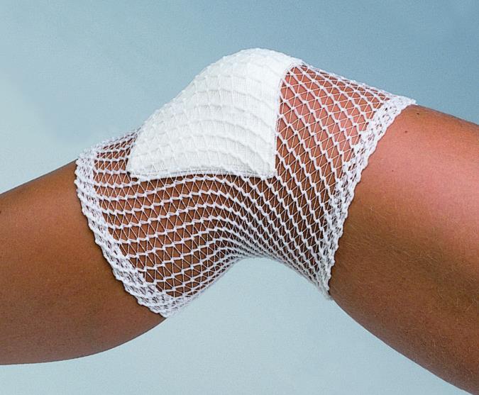 Großmaschiger, hochelastischer Schlauchverband; aus polyamid-umsponnenen Gummifäden und gekräuseltem Polyamidgarn nahtlos gestrickt